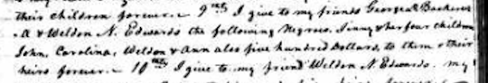 Transcript: “I give to my friends George D Baskerville and Weldon N Edwards the following negroes, Jinny and her four children, John, Carolina, Weldon and Ann also five hundred dollars to them.